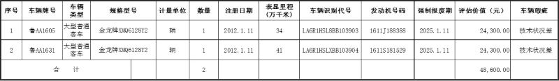 受委托,我公司将于2025年1月21日14:00在济南公共资源交易中心电子交易系统公开拍卖 2 辆下线金龙牌客车报废拆解服务权 。详见标的清单,本次拍卖采用网络拍卖的方式举行。