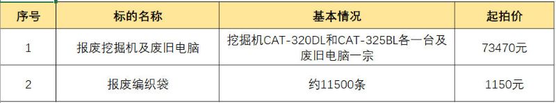 报废挖掘机、办公电脑、编织袋物资拍卖公告