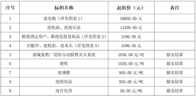 受委托,我公司将于 2025年11月28日9:00在中拍平台举行废电瓶、废机油、废铁等闲废物资一宗拍卖会。详见标的清单,本次拍卖采用网络拍卖的方式举行。
